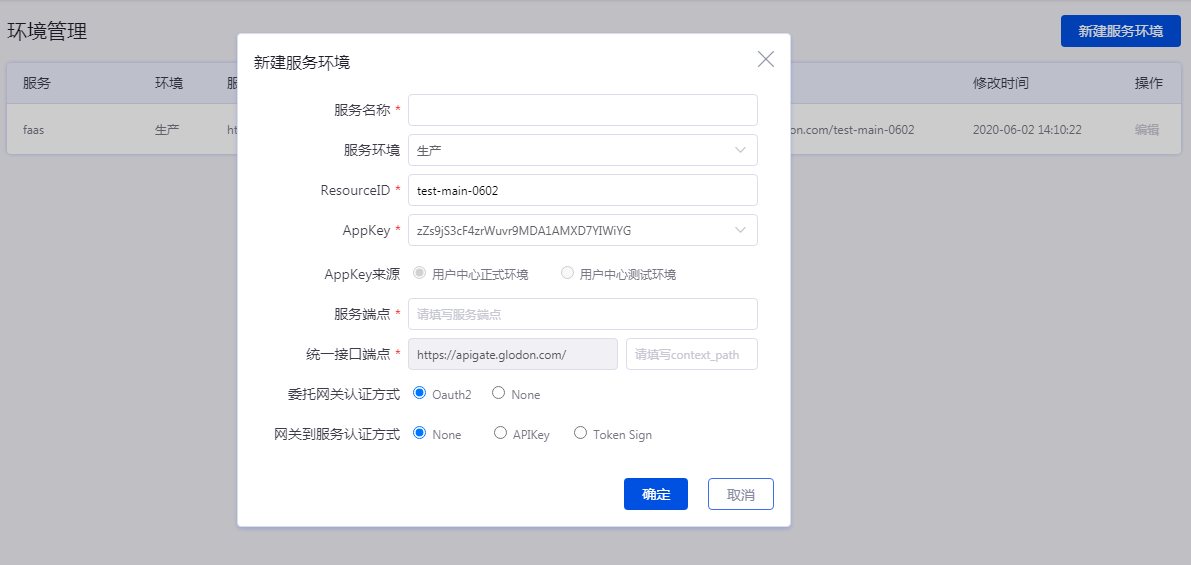 服务名称: 即技术服务的中文名称,如果是多个微服务,可创建多个服务环境;
