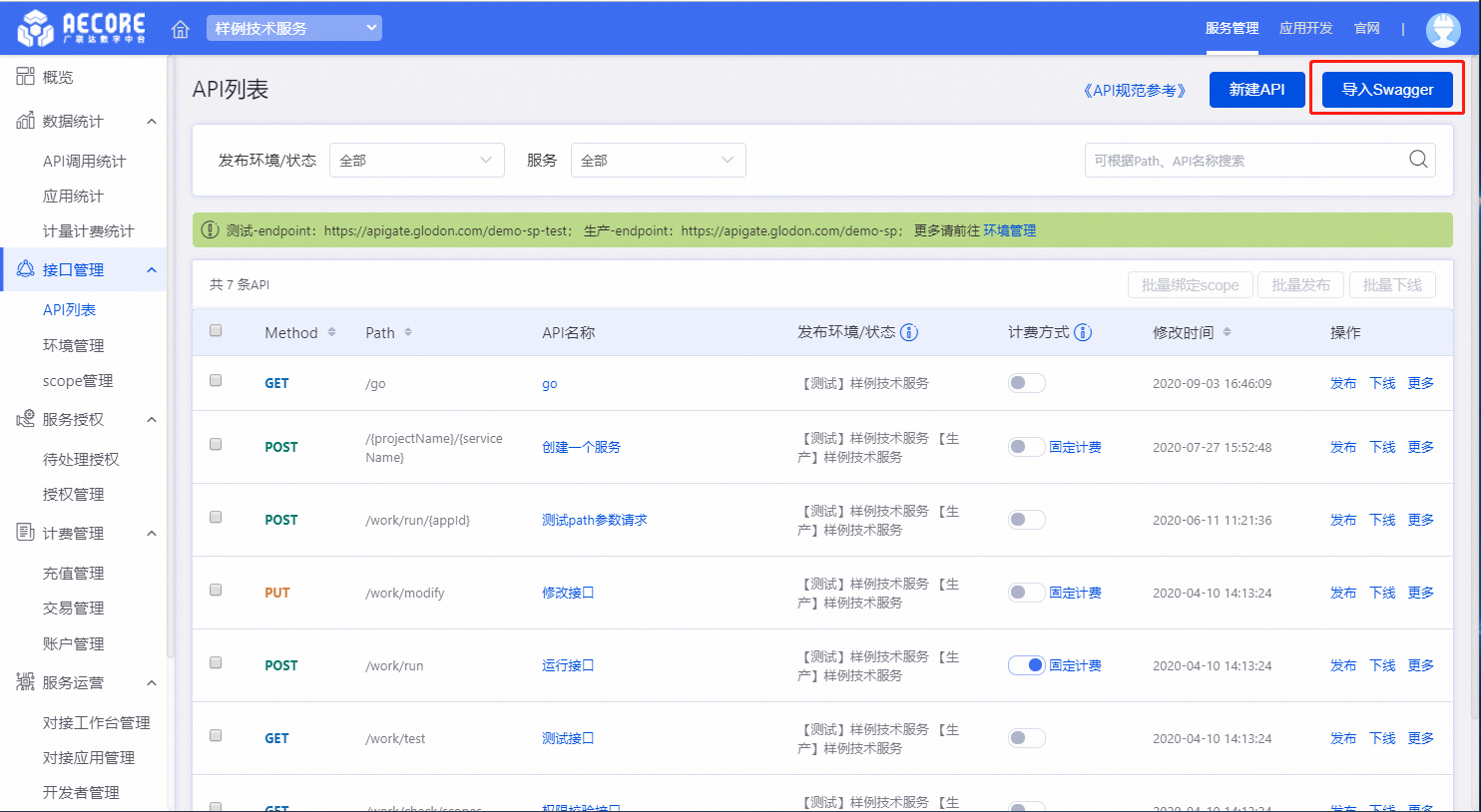 在SP控制台下的接口管理菜单中选择API列表,进行API的创建。这里提供两种创建API的方式供您选择,分别是创建单个API和通过swagger批量创建API。