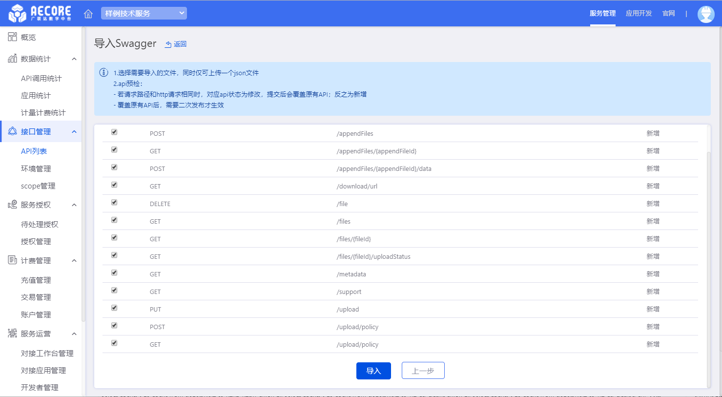 在API列表页面点击导入swagger,选择导入的文件,同时仅可上传一个json文件。