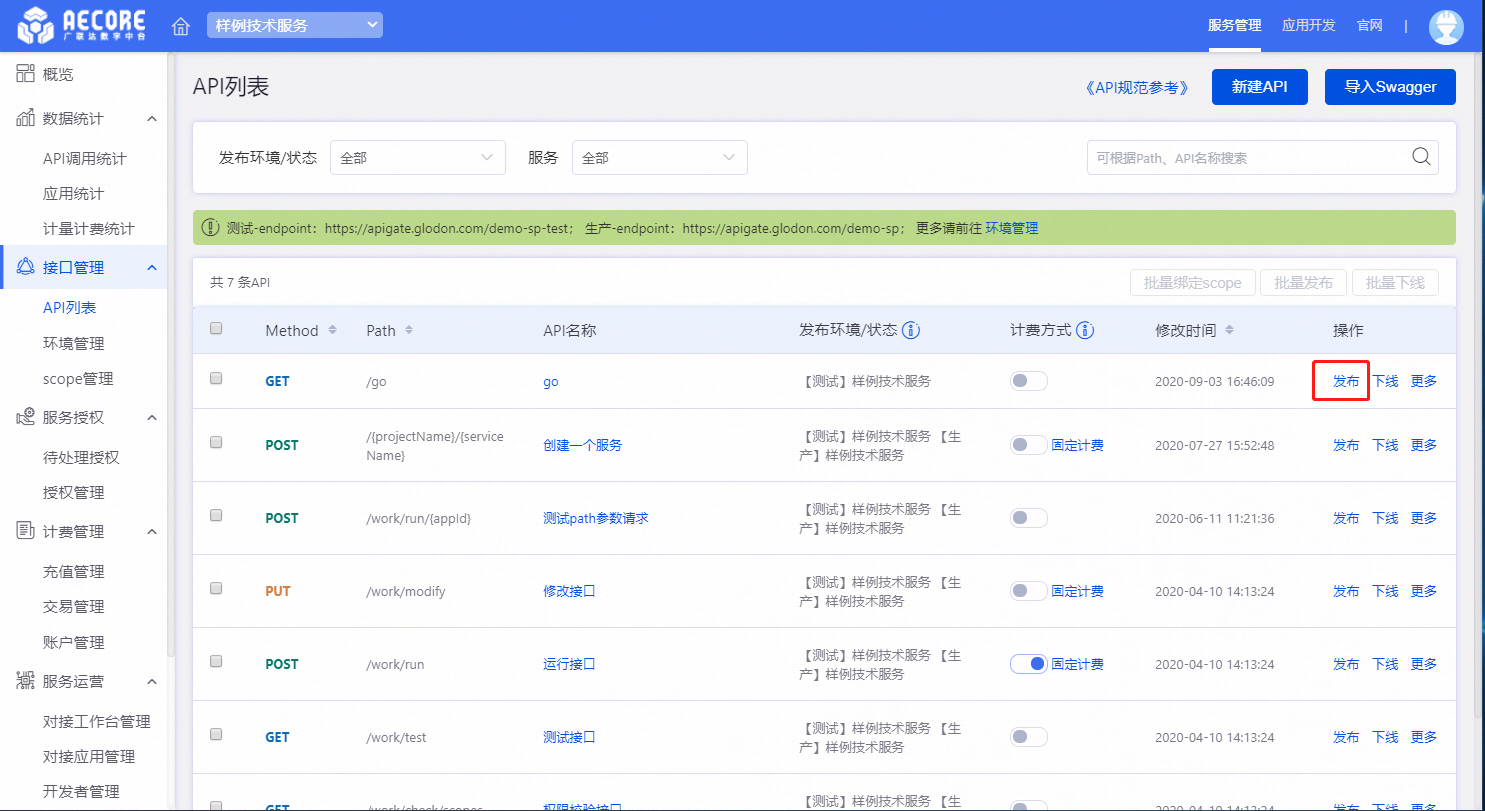 也可以批量发布多个API。在左侧勾选多个API之后点击批量发布。