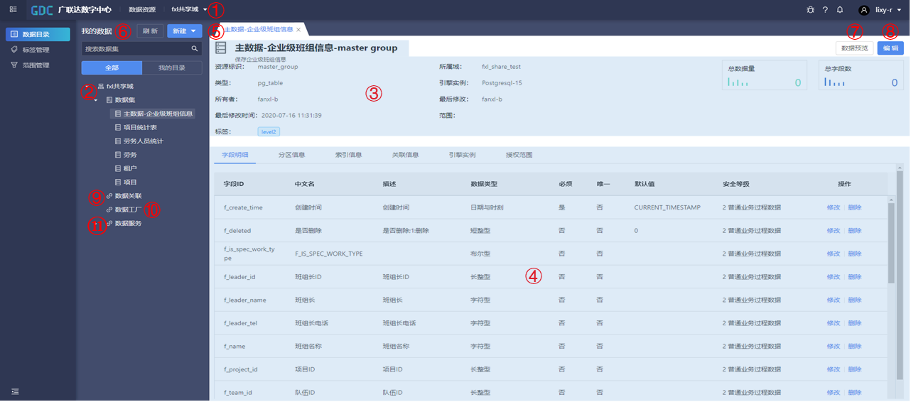 ③根据②中选择的数据资源,显示对应数据资源信息,包括数据资源名称、资源标识、所属域、类型、引擎实例、所有者、最后修改用户名称、最后修改时间、范围和标签信息,以及数据资源的总数据量和总字数段。