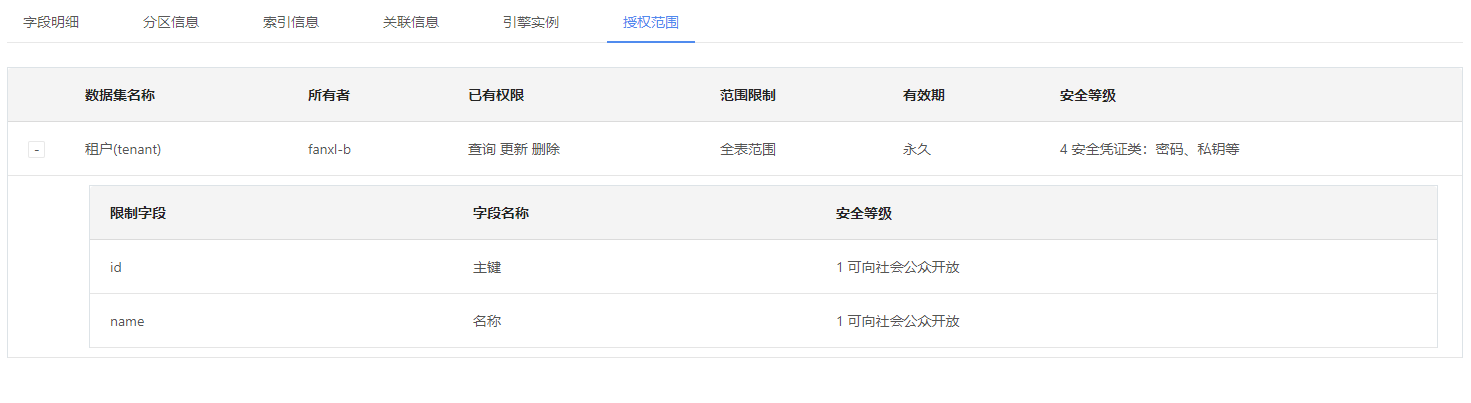 按下②的“+”后,可查看到对应数据资源中的字段信息,包括限制字段、字段名称和安全等级。
