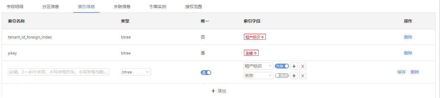 其中其他信息包括字段信息、分区信息、索引信息、关联信息、引擎实例和范围授权,在本节中,将对这几类信息进行详细介绍。