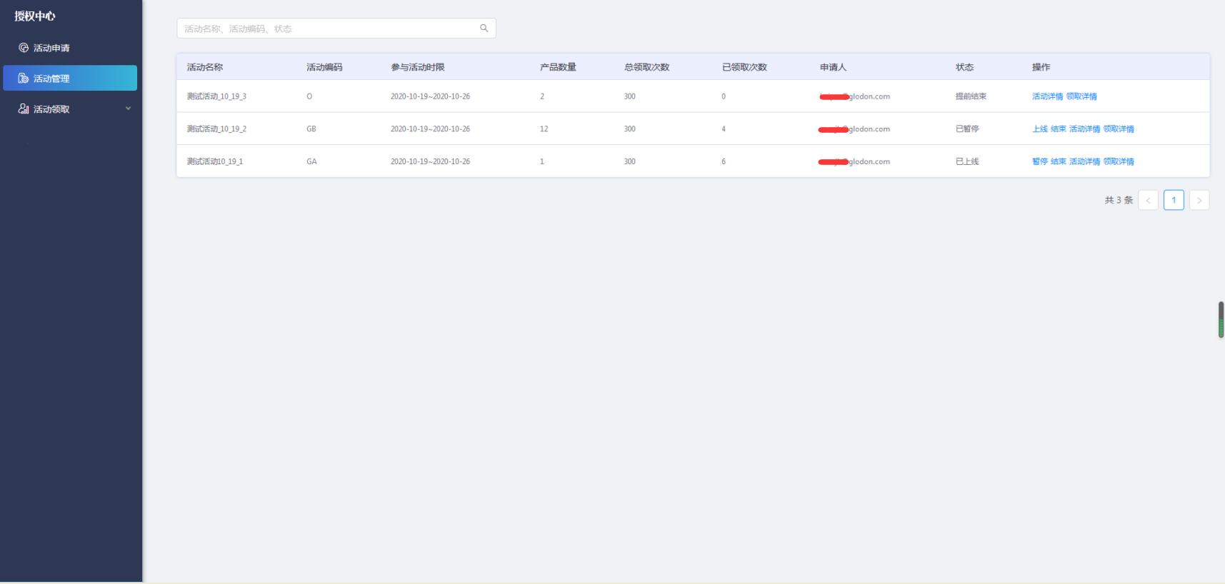 产品运营人员登录AECORE,打开授权中心服务,选择“活动管理”标签页,可以对自己申请的活动进行状态管理,查询活动详情和领取详情。
