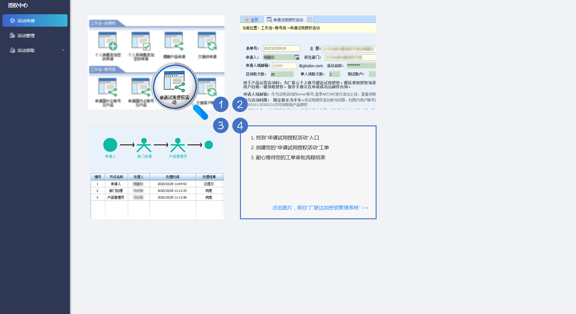 产品运营人员登录AECORE,打开授权中心服务,选择“活动申请”标签页,根据该标签页提示,在GMS系统中进行活动申请操作。