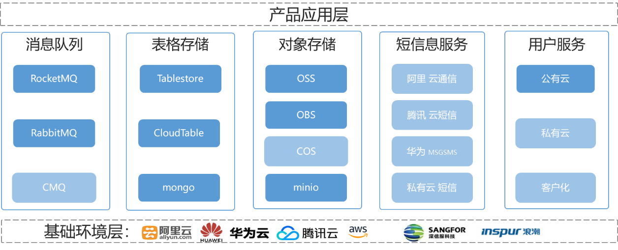 ​ 云中立SDK是通过抽取多云适配抽象层,对产品中用到的中间件或基础服务进行的封装适配,通过配置的不同,来实现公司产品在多云环境下的平滑部署、迁移。其通过提供相应的SDK及服务,屏蔽掉公有云及私有云Paas层中间件不统一的问题,包括:对象存储,消息队列,表格存储及基础服务适配,用户中心等。