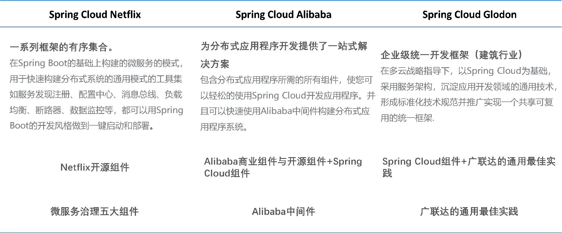 ​ 从上表可以看出,Spring Cloud Netflix 与Spring Cloud Alibaba是以微服务治理为核心的分布式应用程序开发解决方案,主要内容包括服务注册发现、服务网关、配置中心、服务链路追踪等组件。而Spring Cloud Glodon是以6686体育官网首页通用最佳实践为核心的企业级开发框架,主要内容Spring Cloud组件、6686体育官网首页通用最佳实践。