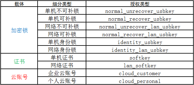 - 授权类型:销售系统会将一次订单包含的多件产品组织到一个载体上,方便分类管理。目前,按照用户的使用场景划分,可用的载体类型有:加密锁、证书和云账号。针对这些载体类型,授权中心提供了对应的授权类型。