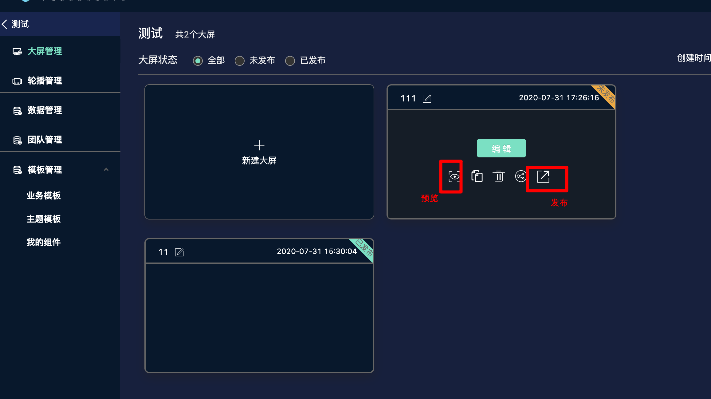 • 大屏管理页面,鼠标滑动到您想预览的大屏上,点击预览按钮即可完成预览