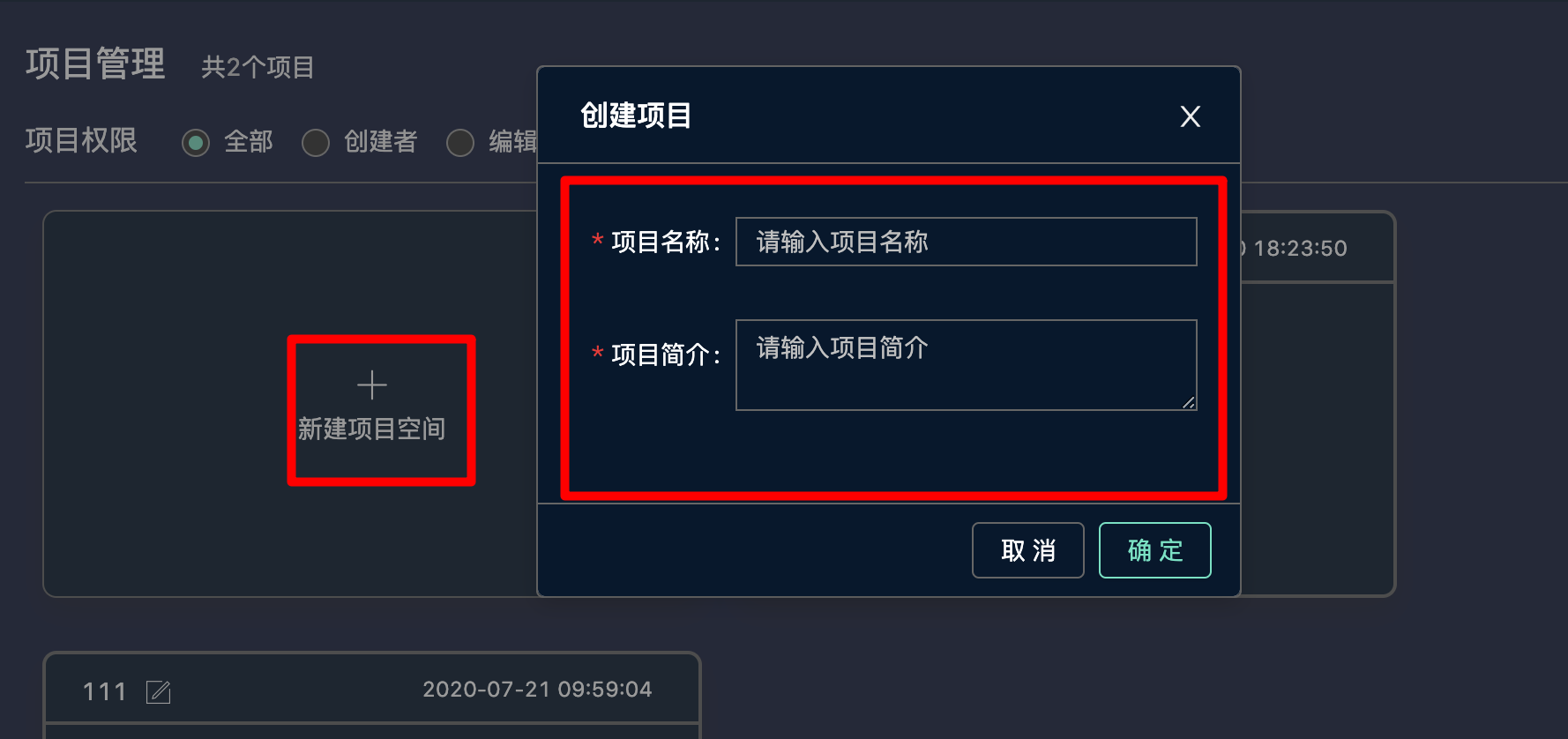 • 在项目管理页面中,单击新建项目空间
