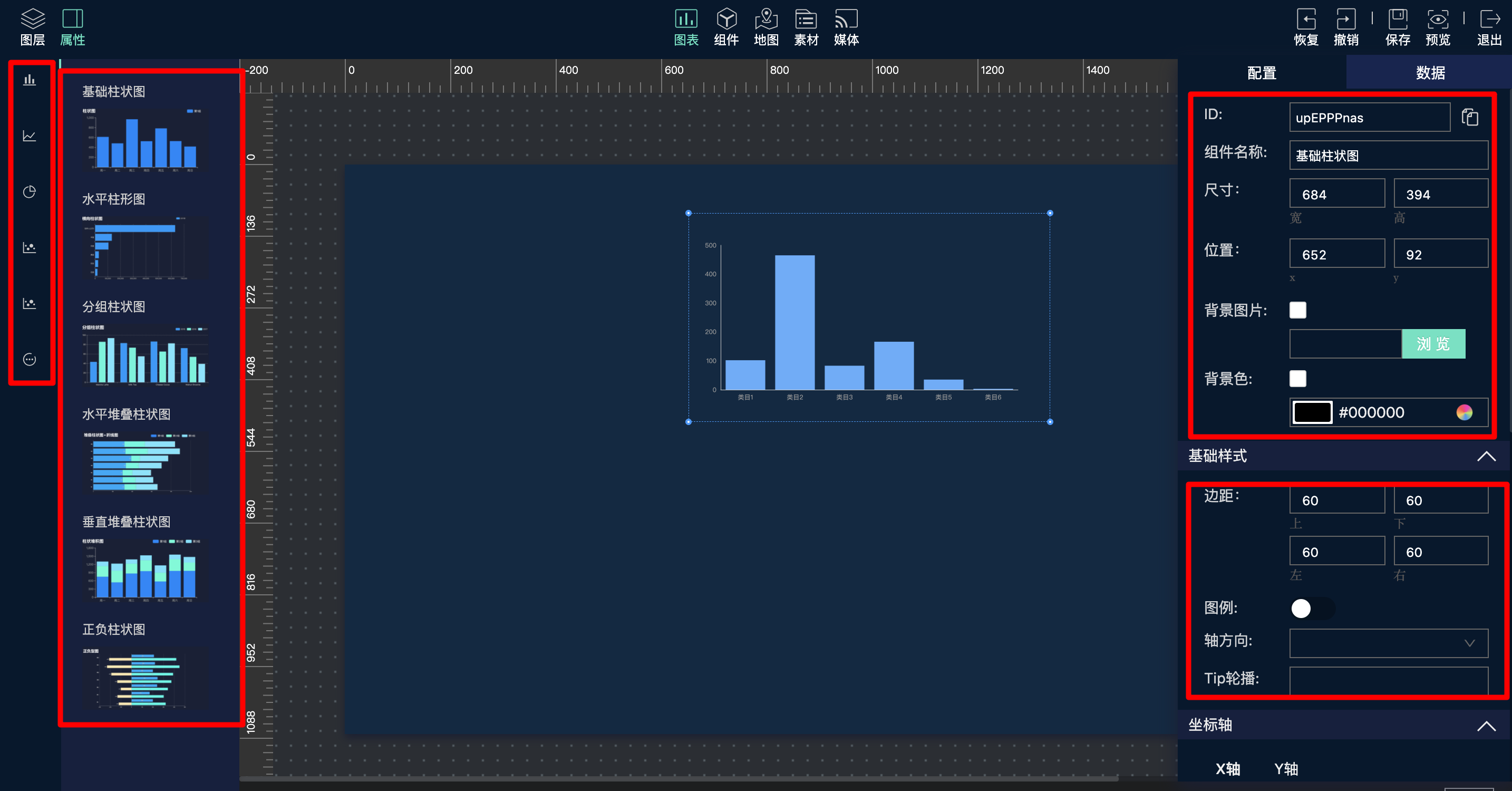 您可以通过组件列表选择您想要的组件,并根据需要配置完成各组件的不同样式配置 如:全局样式、基础样式、坐标轴等...