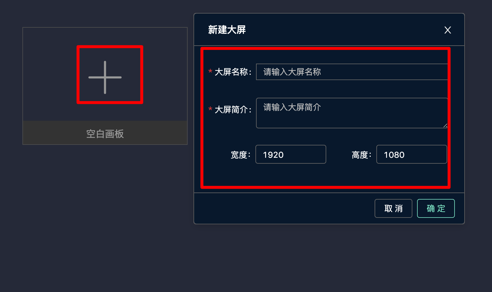 • 在弹出界面中对大屏名称、简介以及宽高进行填写编辑即可完成大屏的新建