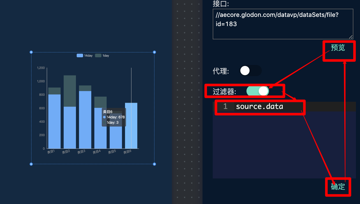 当您完成数据源的选择后,接口处会显示您所配置的数据源,点击预览即可预览您配置的数据,如需使用过滤器请按照如下步骤执行: