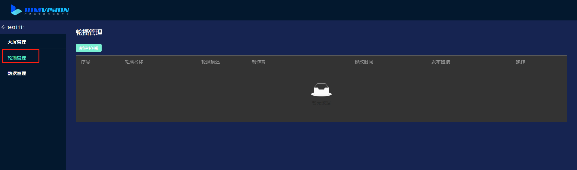 轮播管理为该项目创建和管理轮播特效,通过点击某项目后进入到轮播管理菜单,包括新建轮播和轮播管理功能。