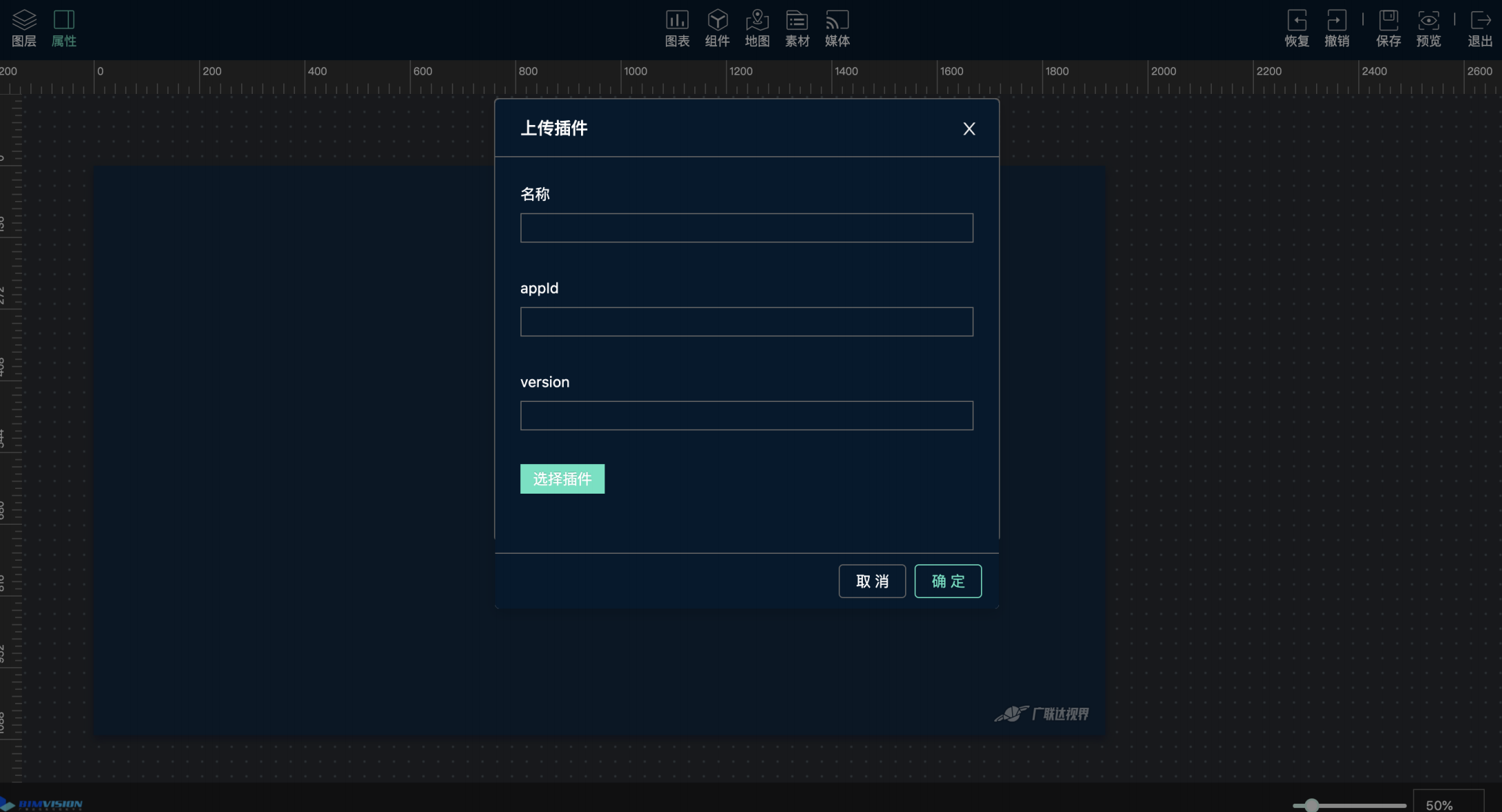 打开可视化平台、登录账户、创建项目、大屏、打开编辑器、快键键cmd/ctrl+u打开插件上传入口