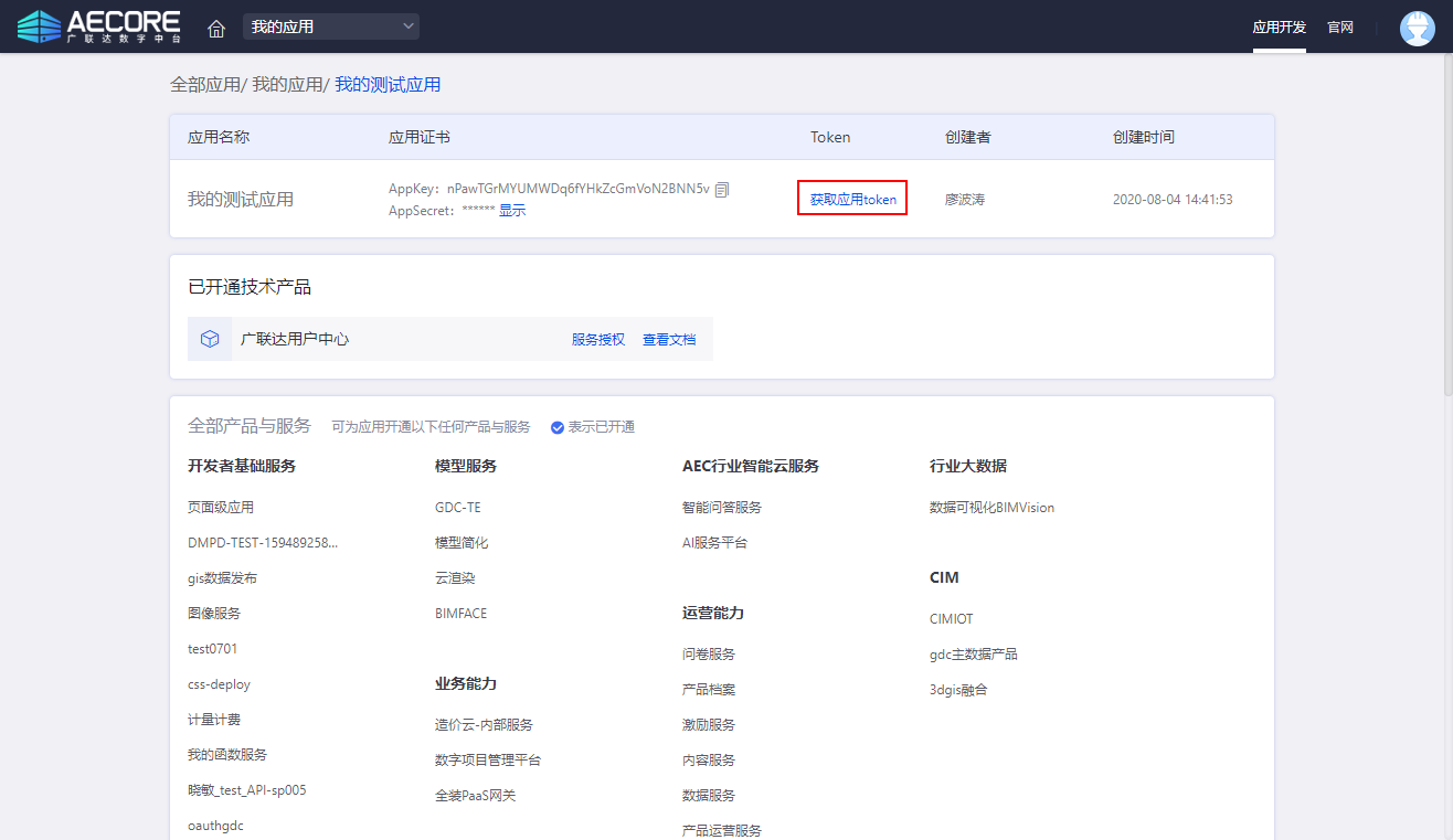登录AECORE,并创建应用,创建应用后即可获取appkey、appsecret,这是调用服务的秘钥请妥善管理。
