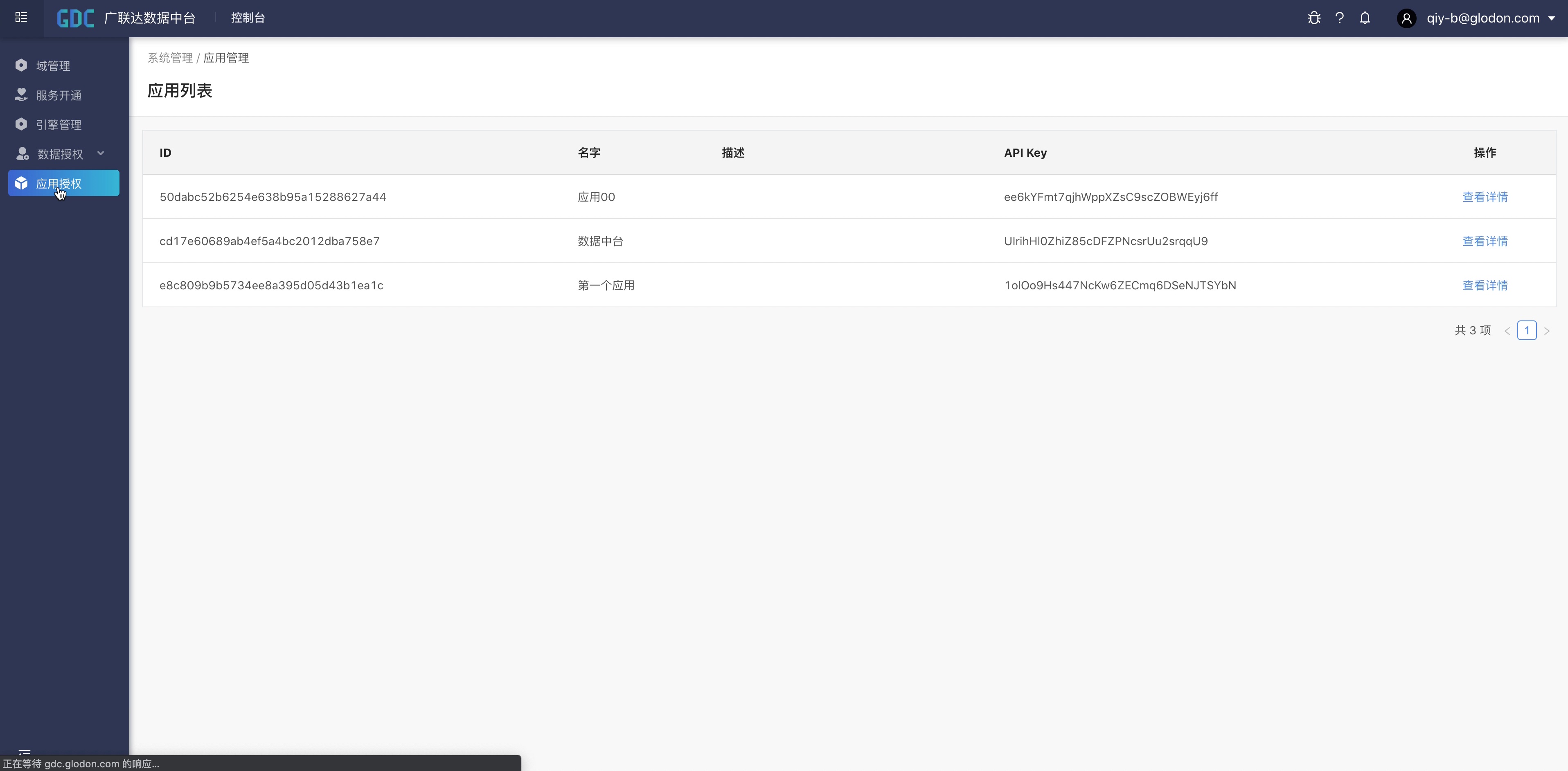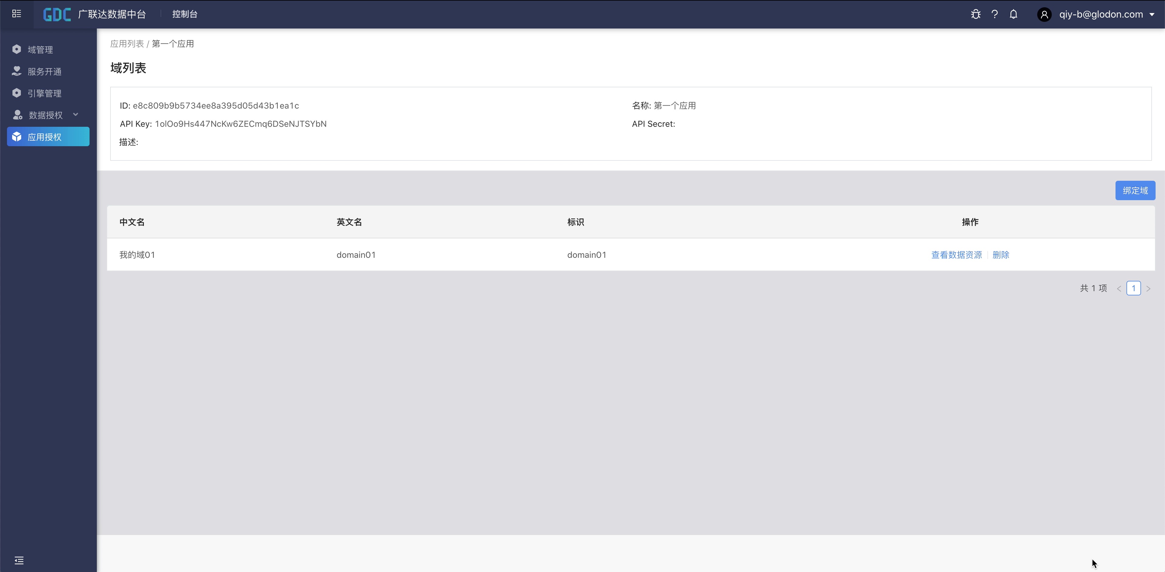 这样,我们就已经完成了应用的授权。可以通过应用的密钥信息,来访问已绑定域里面的所有资源信息了。