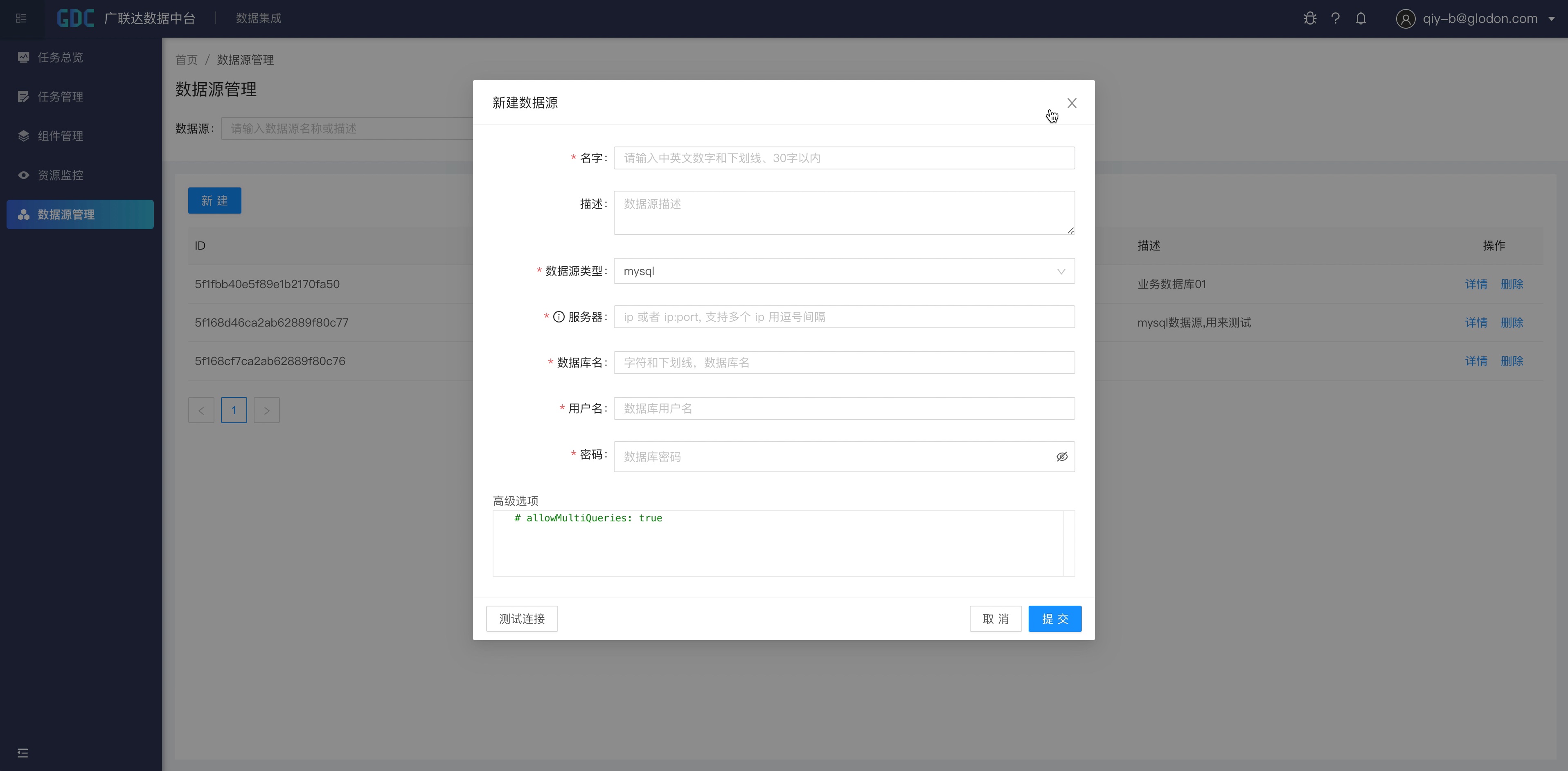 进入到数据中台的数据集成模块,首先在数据源管理里面配置好我们的数据来源的信息。