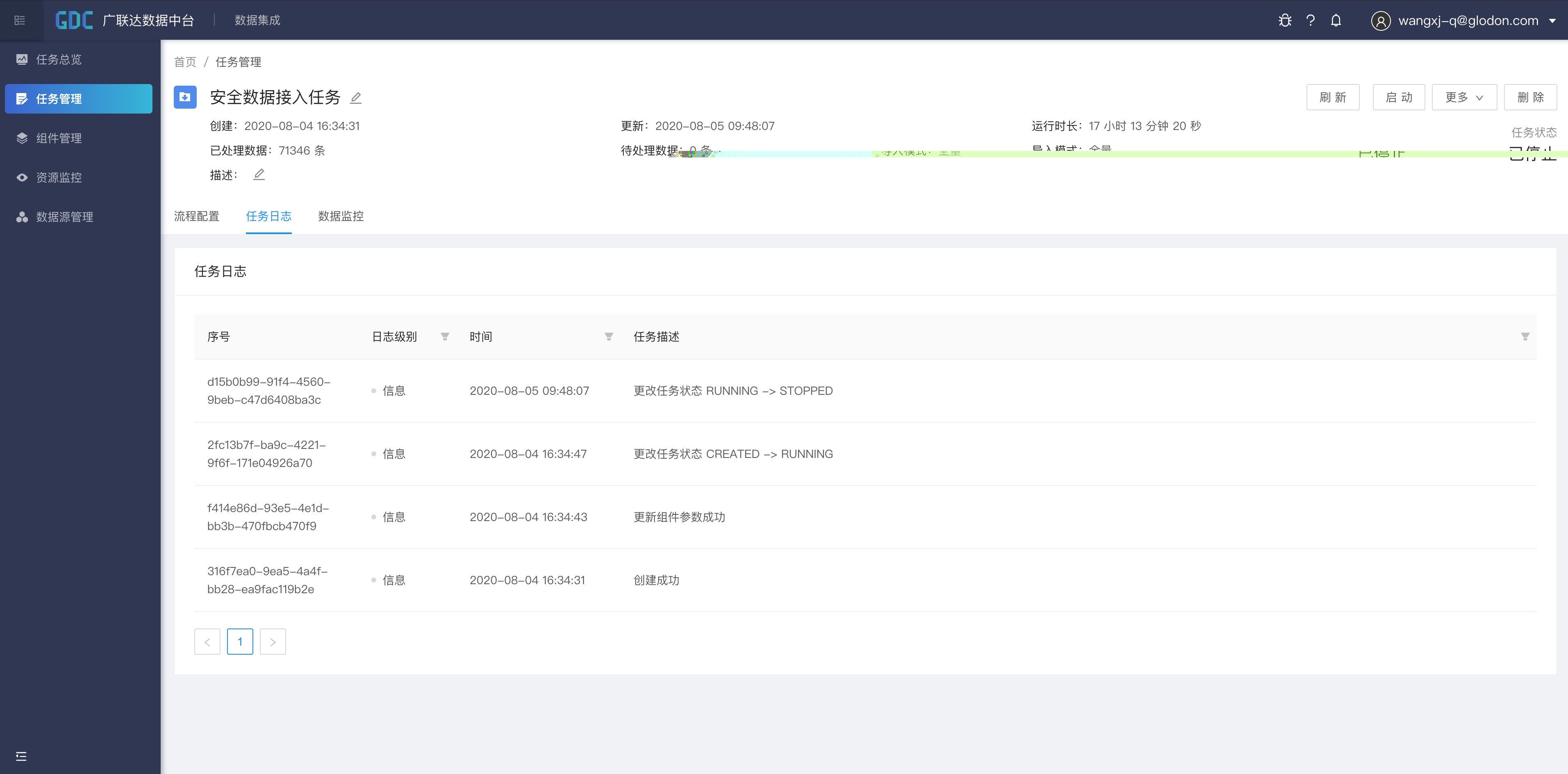 点击任务上方的“启动”按钮,集成任务正式开始运行。