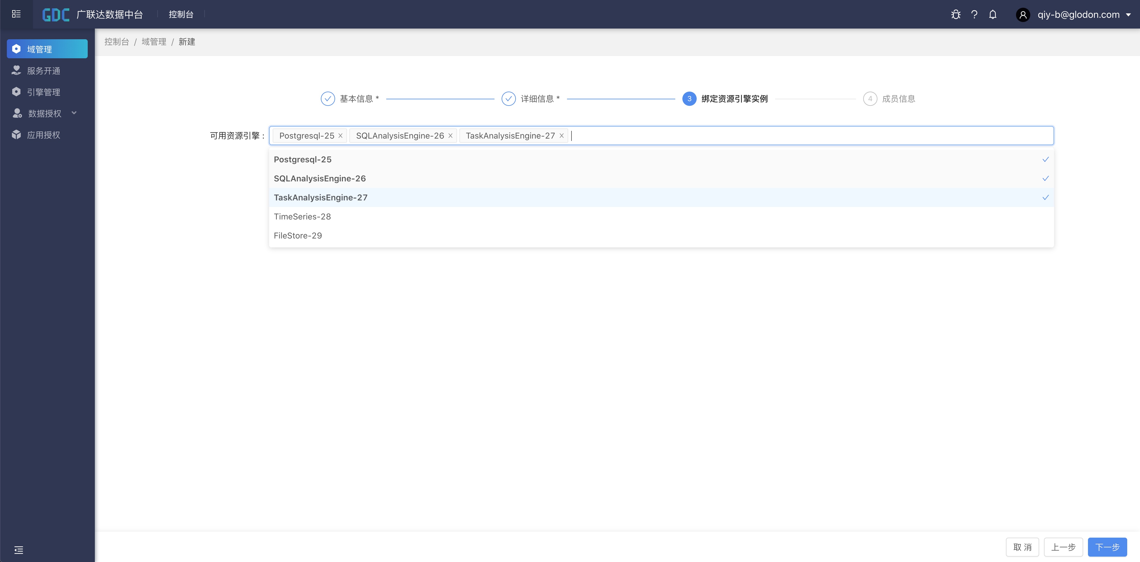 选择创建域的资源引擎实例,支持多选。根据所要创建的数据资源类型进行选择,我们的场景只需要选择PostgreSQL、SQLAnalysis、TaskAnalysis就够了。