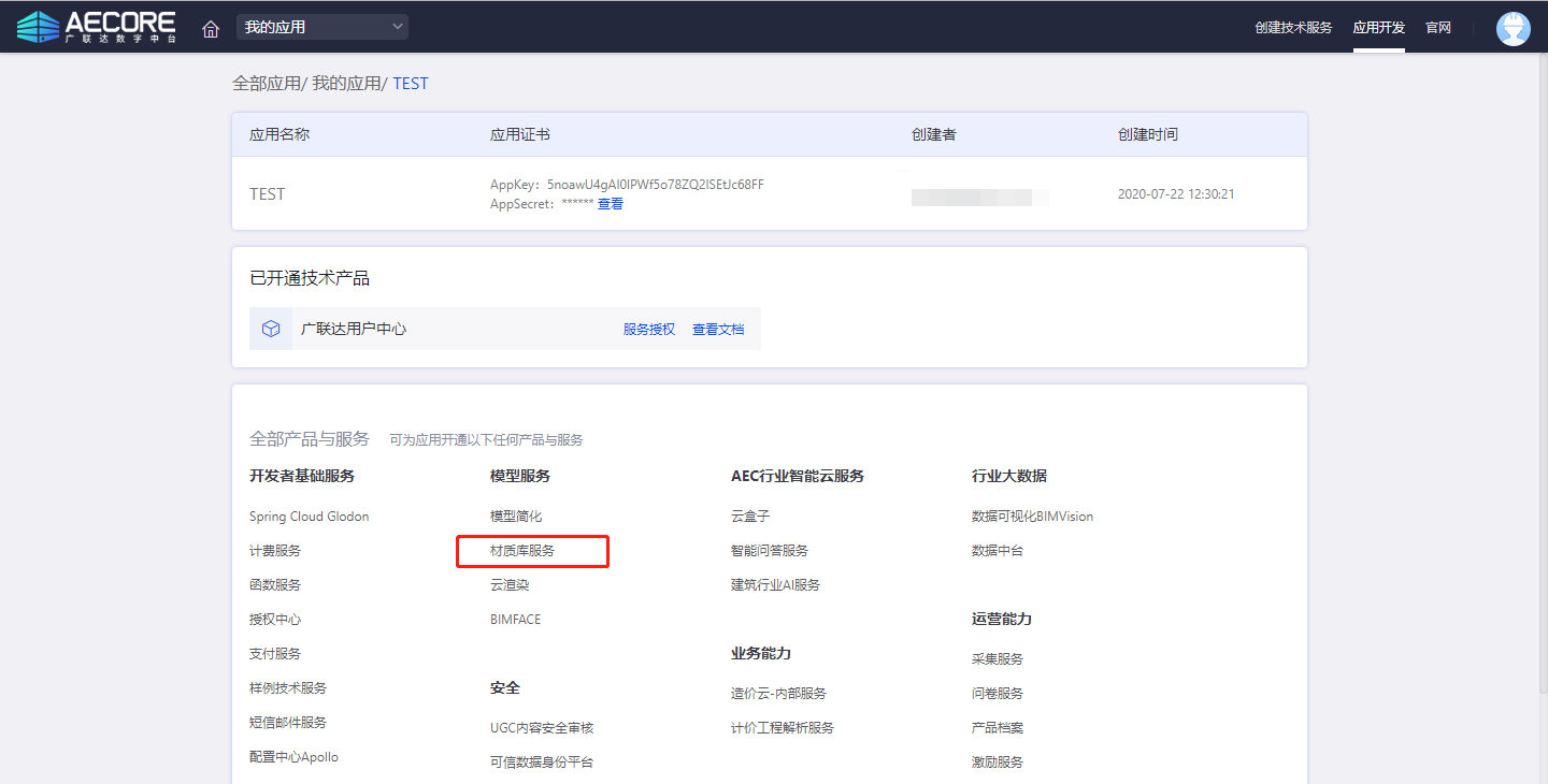 首先需要通过AECORE创建应用,申请开通材质库服务权限,待人工审核通过后,可开始集成使用材质库服务。